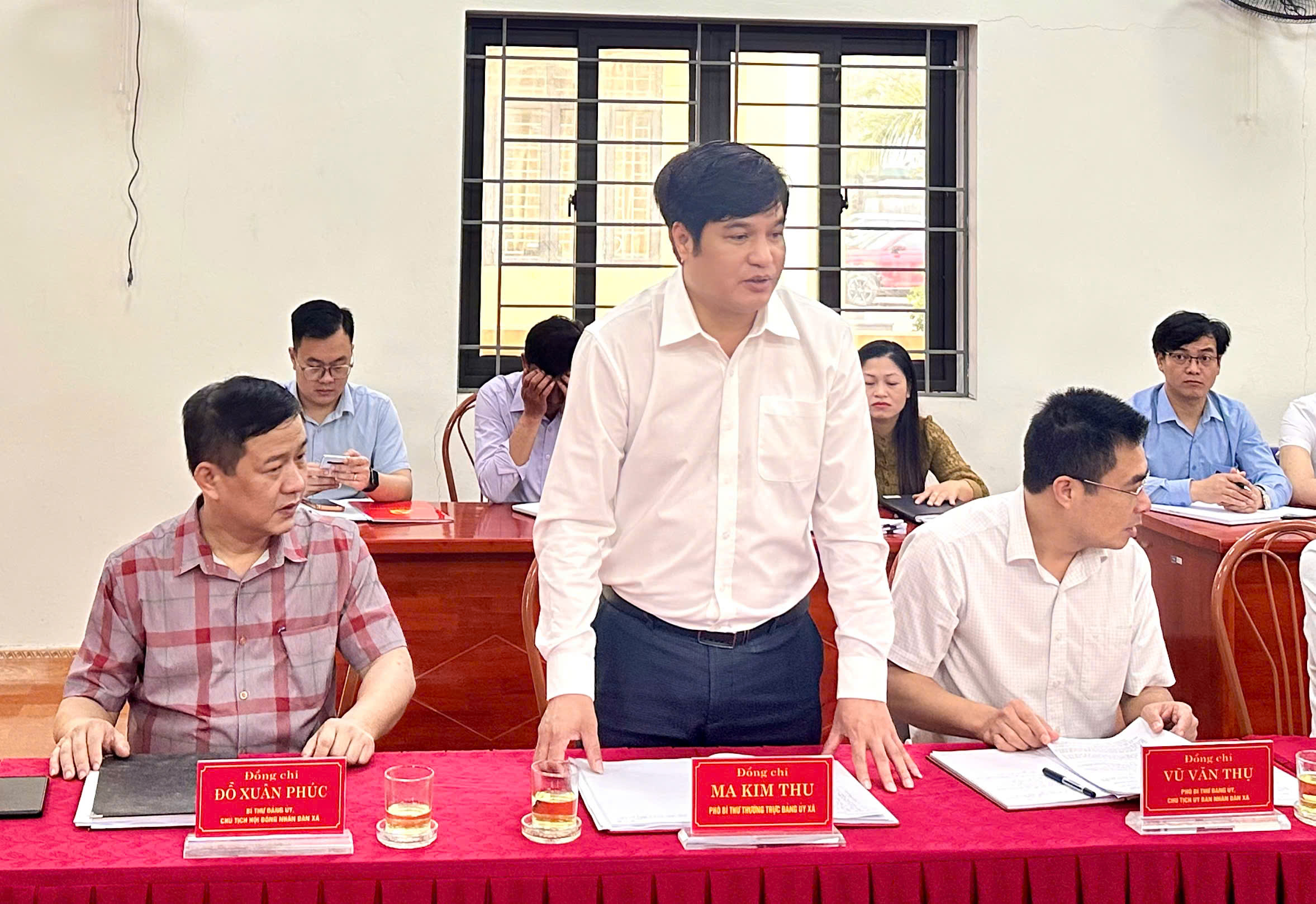 Tiếp và làm việc với đoàn kiểm tra có các đồng chí: Đỗ Xuân Phúc, Bí thư Đảng ủy, Chủ tịch HĐND xã; Vũ Văn Thụ, Phó Bí thư Đảng ủy, Chủ tịch UBND xã; Ma Kim Thu, Phó Bí thư Thường trực Đảng ủy; Các đồng chí Ủy viên BTV Đảng ủy; Lãnh đạo HĐND, UBND, Uỷ ban MTTQ Việt Nam xã; Trưởng, Phó các cơ quan tham mưu, giúp việc Đảng ủy; Lãnh đạo Phòng Kinh tế, đại diện Chi bộ cơ sở được kiểm tra, giám sát.