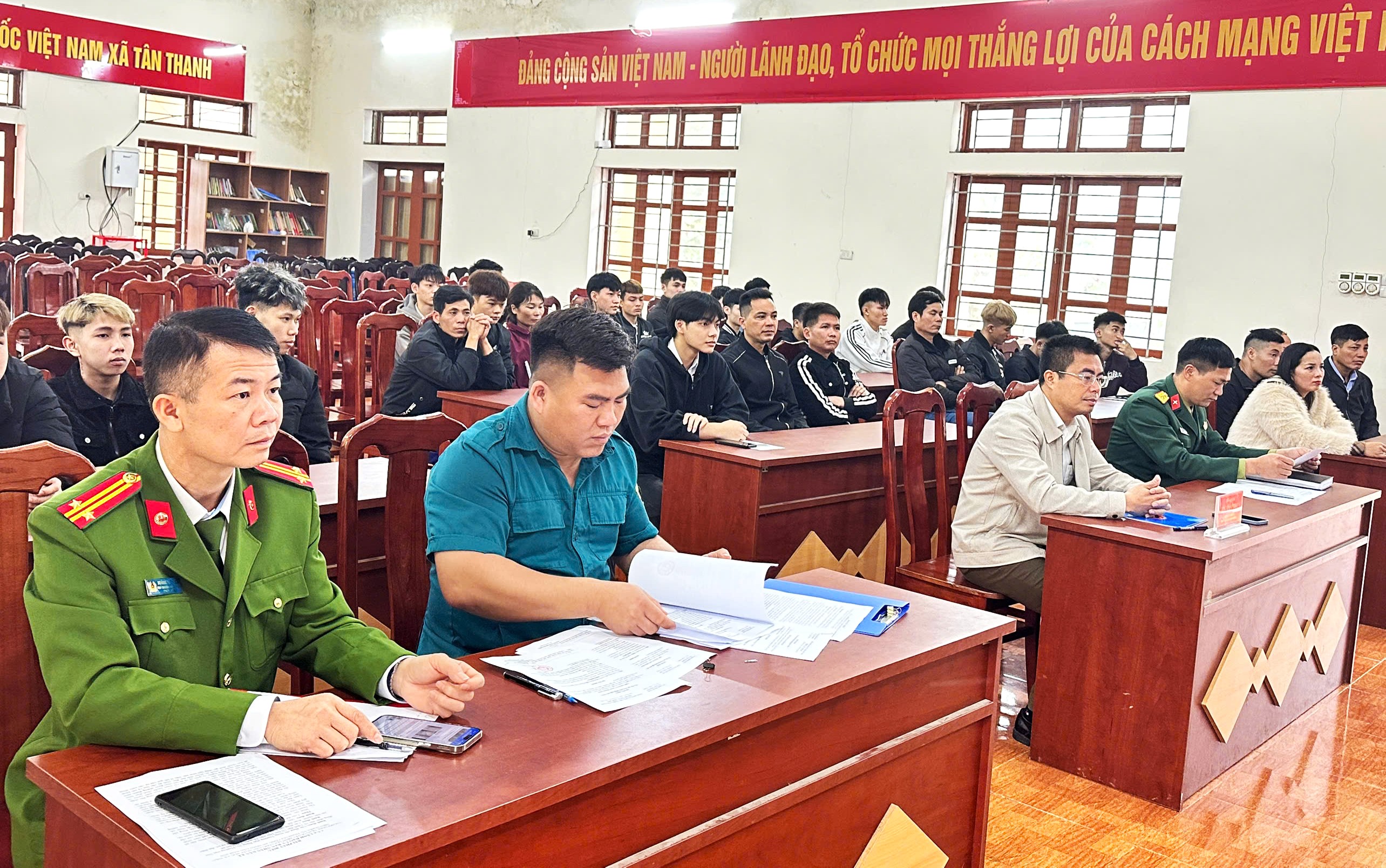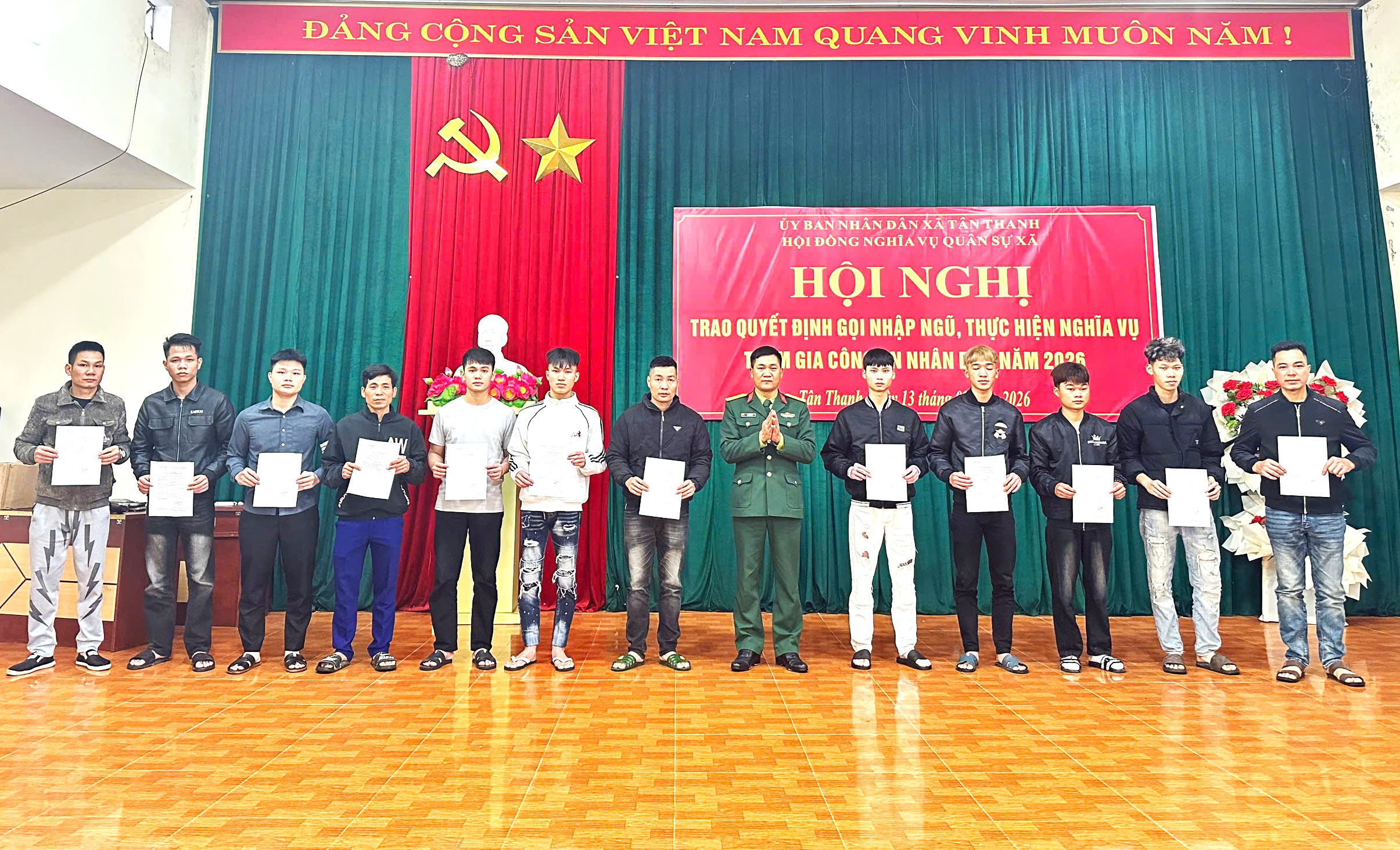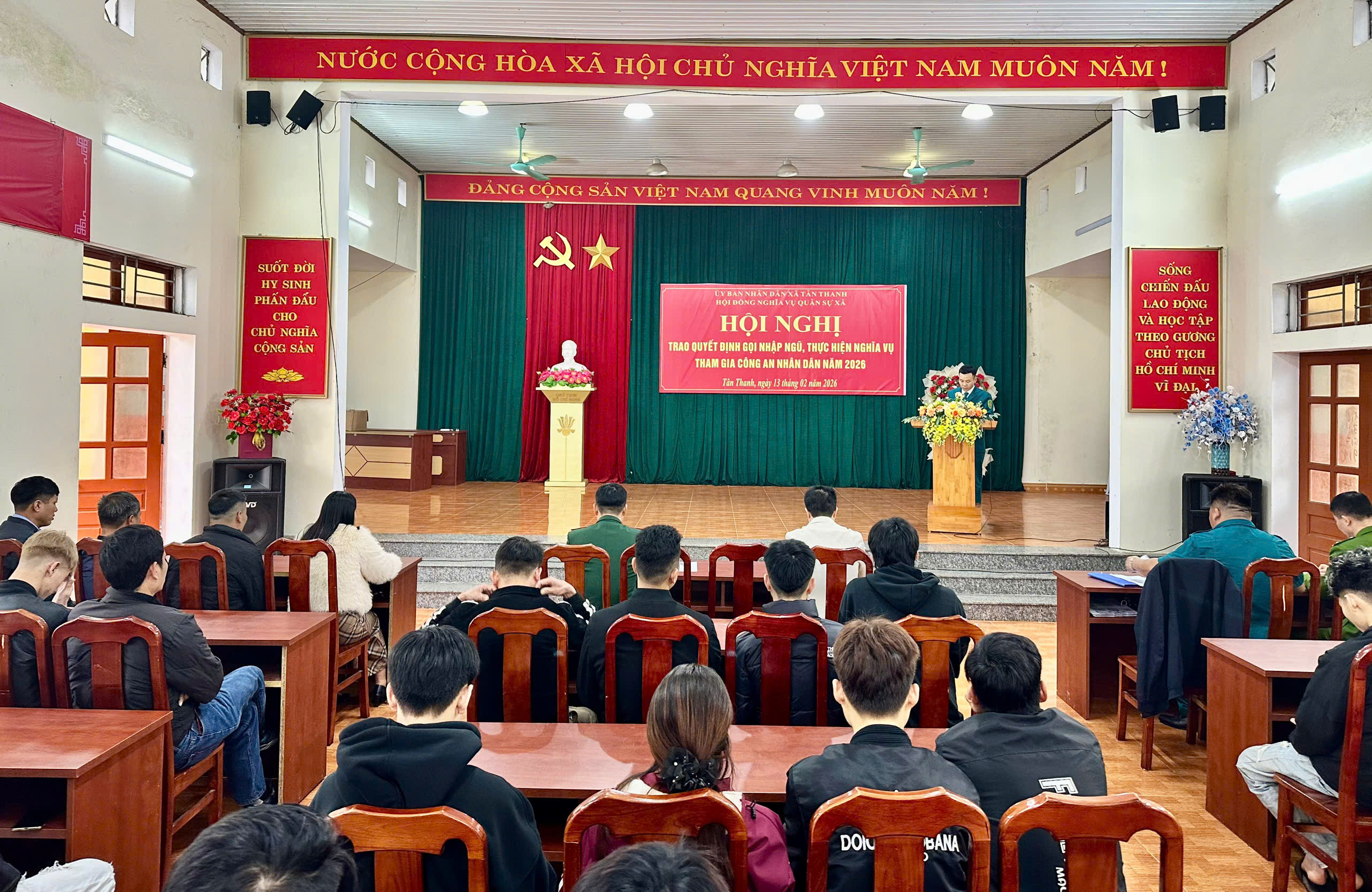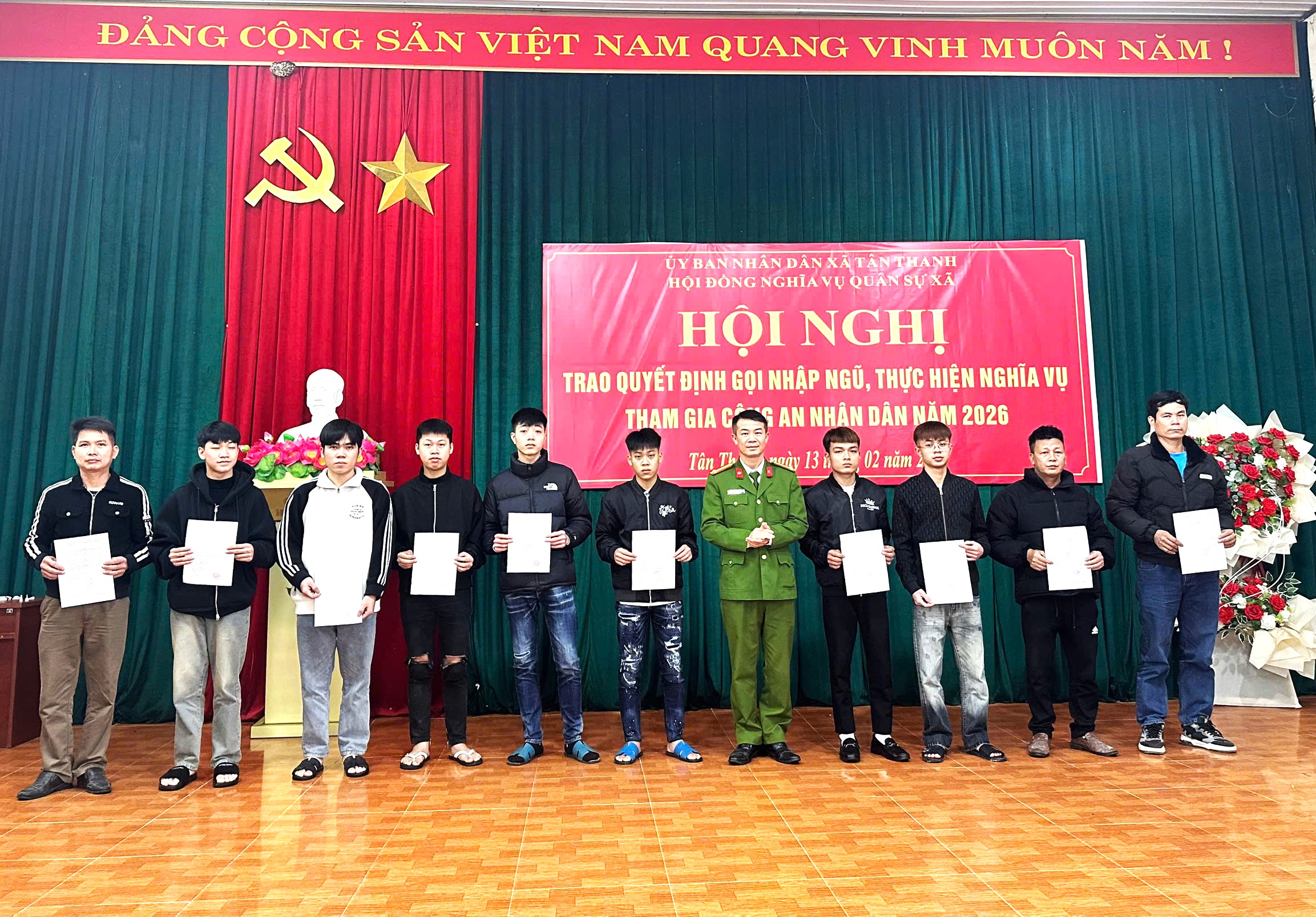 Năm 2026, xã Tân Thanh có 28 công dân nhận quyết định gọi công dân nhập ngũ và thực hiện nghĩa vụ tham gia Công an nhân dân, 6 công dân dự phòng đủ điều kiện bảo đảm chỉ tiêu giao quân cấp trên giao. Tất cả thanh niên được trao quyết định gọi công dân nhập ngũ và thực hiện nghĩa vụ tham gia Công an nhân dân đều có sức khỏe tốt, có tư tưởng chính trị, lập trường vững vàng, tuyệt đối tin tưởng vào sự lãnh đạo của Đảng