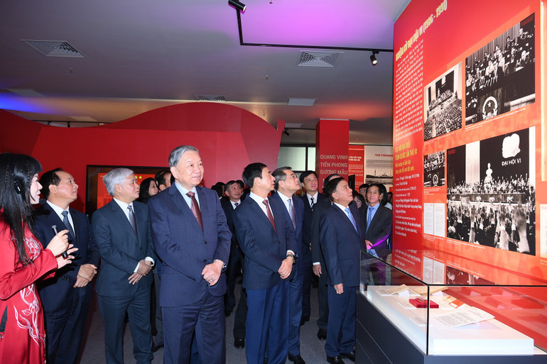 Tổng Bí thư Tô Lâm và các đồng chí lãnh đạo Đảng, Nhà nước tham quan triển lãm. (Ảnh ĐĂNG KHOA)