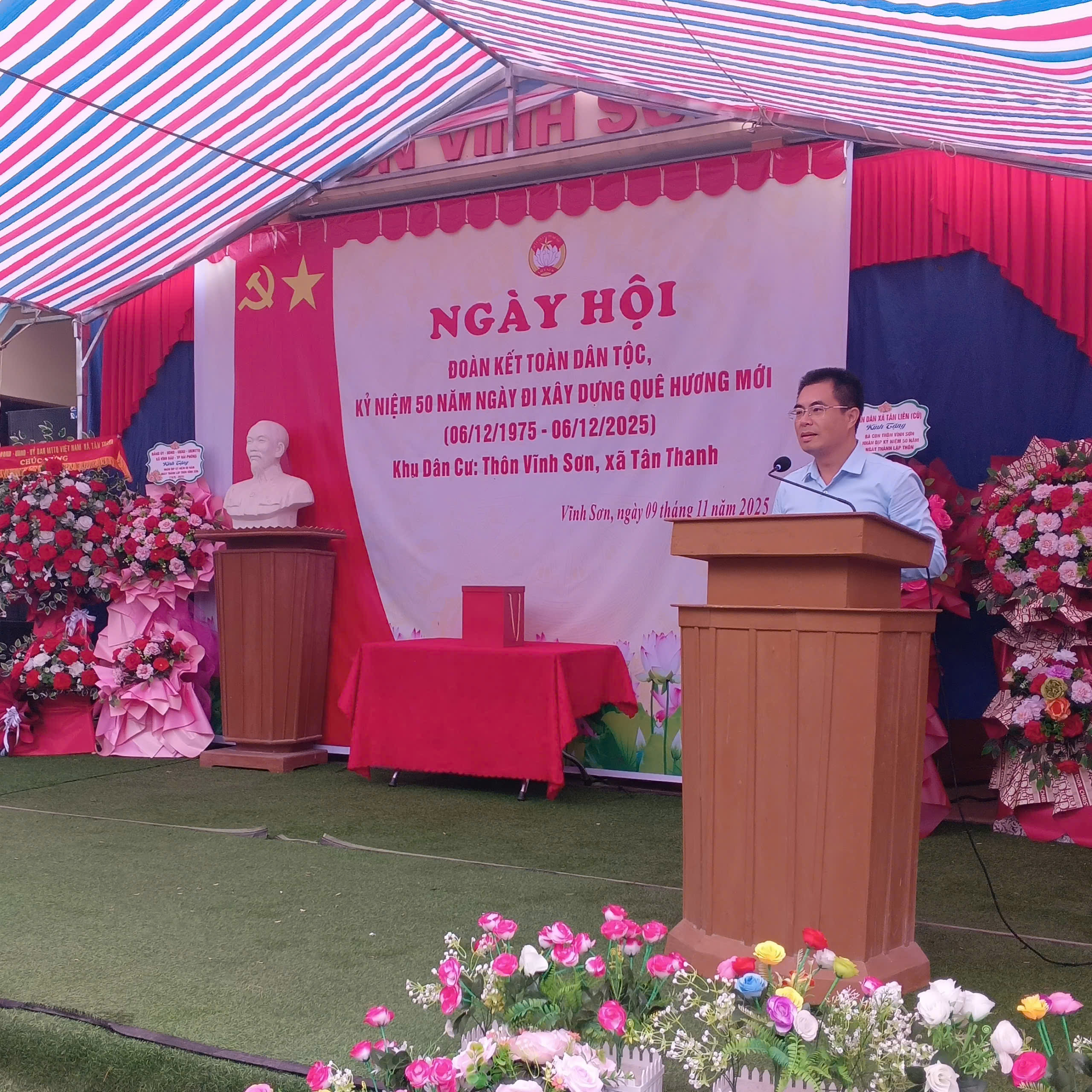 Phát biểu tại ngày hội, đồng chí Vũ Văn Thụ – Phó Bí thư Đảng ủy, Chủ tịch UBND xã Tân Thanh ghi nhận và biểu dương những kết quả nổi bật mà cán bộ, đảng viên và nhân dân thôn Vĩnh Sơn đã đạt được trong suốt chặng đường 50 năm qua. Đồng chí nhấn mạnh: “Từ những ngày đầu gian khó đi mở đất, đến nay Vĩnh Sơn đã trở thành khu dân cư kiểu mẫu, đoàn kết, văn minh, đời sống nhân dân ngày càng ấm no, hạnh phúc. Thành quả hôm nay là minh chứng cho tinh thần vượt khó, đoàn kết, sáng tạo của các thế hệ nhân dân trong thôn.”