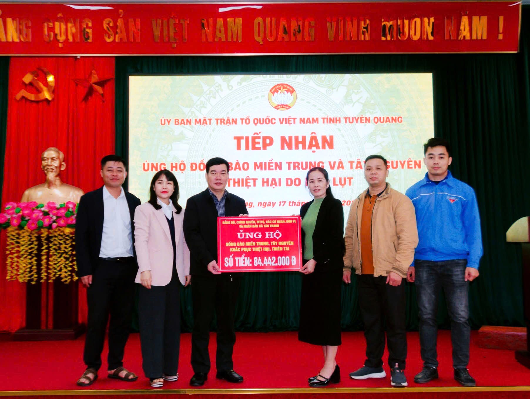 Ngày 17-12, đồng chí Đàm Thị Vân Anh, Ủy viên BTV Đảng uỷ, Chủ tịch Ủy ban MTTQ Việt Nam xã Tân Thanh đã đại diện cho Nhân dân và cán bộ, công chức, viên chức toàn xã trao số tiền 84.442.000 đồng để ủng hộ đồng bào miền Trung và Tây Nguyên bị thiệt hại do bão lũ.